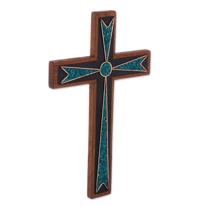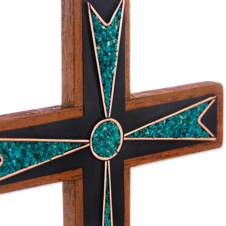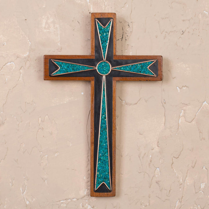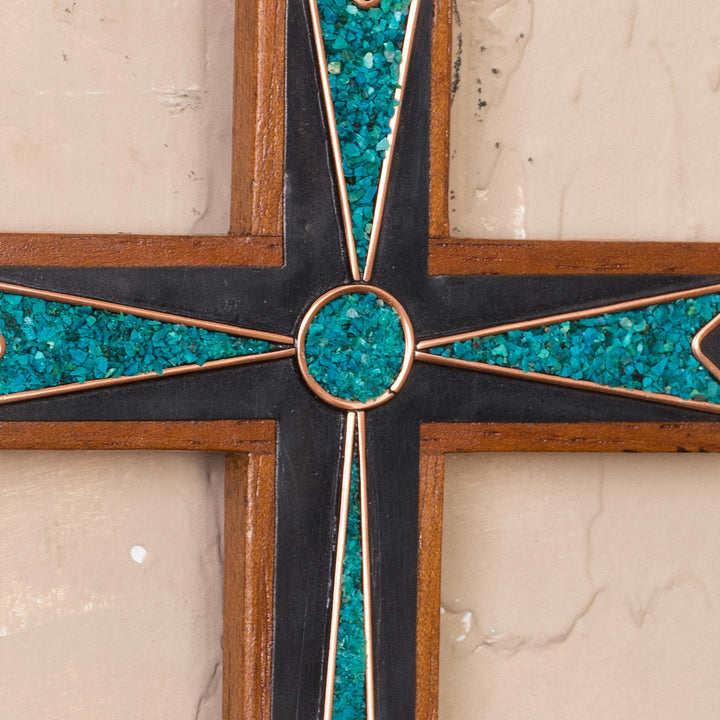 Peruvian artisan Angel Franco handcrafts this stunning wall cross, inspired by his faith. The cross is made of mohena wood, with strips of copper and bronze forming dynamic shapes atop the cross arms. The copper and bronze frame is filled with chrysocolla stones.