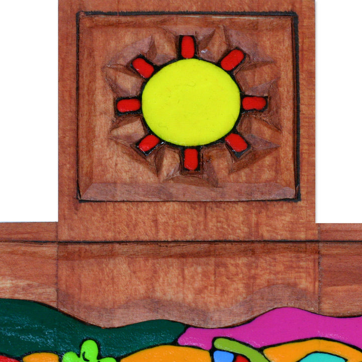 By Woodworkers of Jesus, this cross is carefully crafted of pinewood. Birds and butterflies, a rabbit and armadillo all bring their color to this whimsical design. The motifs are painted by hand to celebrate the flora and fauna of El Salvador.
