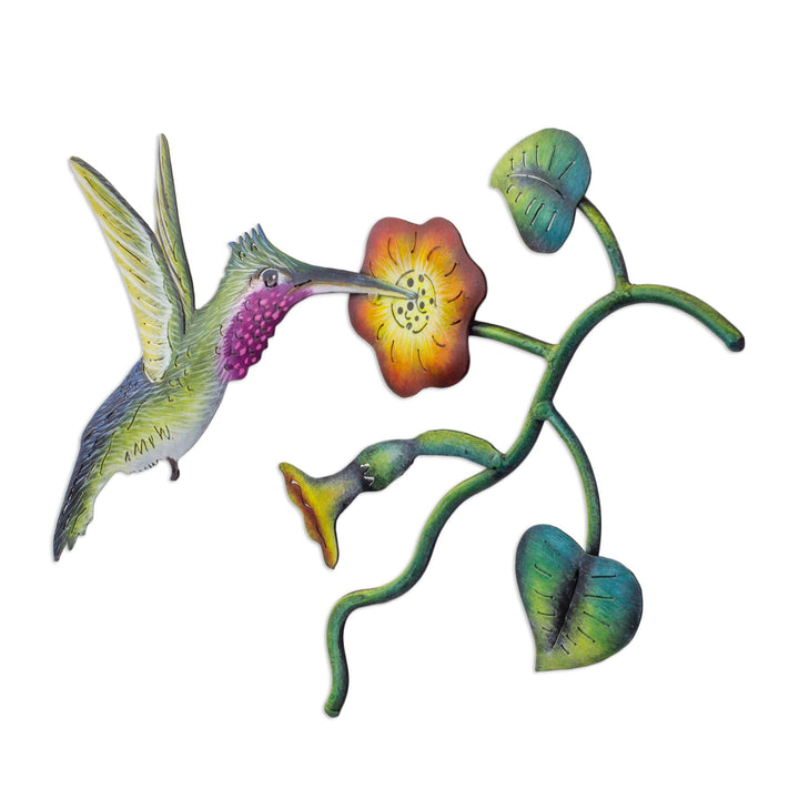 A diligent hummingbird reaches for the sweet nectar of in exotic yellow blooms in this inspired wall sculpture. Alejandro de Esesarte masterfully captures the sense of serenity that comes with observing this lovely scene of the natural world. Transforming steel into art, he cuts out the image and hammers it into a fabulous wall sculpture painted by hand in vibrant Mexican colors.