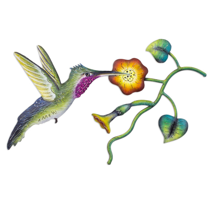 A diligent hummingbird reaches for the sweet nectar of in exotic yellow blooms in this inspired wall sculpture. Alejandro de Esesarte masterfully captures the sense of serenity that comes with observing this lovely scene of the natural world. Transforming steel into art, he cuts out the image and hammers it into a fabulous wall sculpture painted by hand in vibrant Mexican colors.