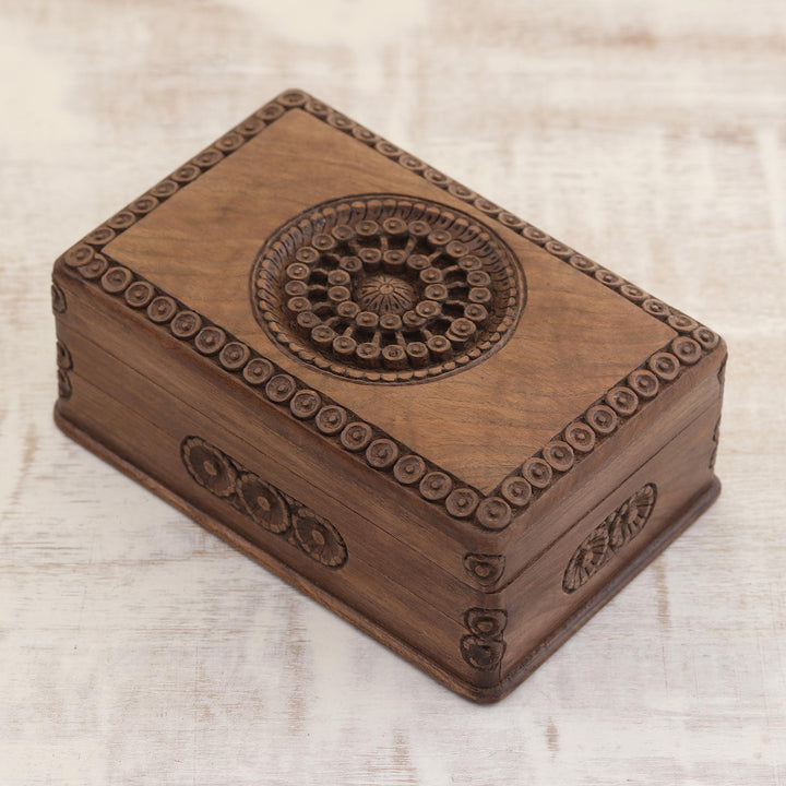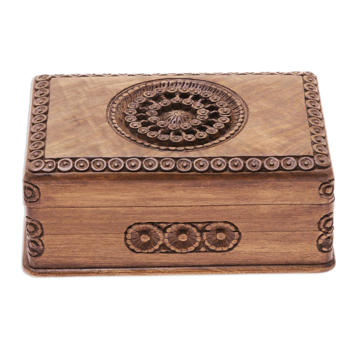 Exquisitely designed box to hold your valuable  jewelry.  M. Ayub presents this hand carved piece, its distinctive appeal characteristic of Kashmiri artistry. A removable shelf – elaborated with a place for precious rings and other small trinkets – allows for convenient storage and organization. The box features a magic lock and can be opened by sliding the lower front panel of the box to the right side.