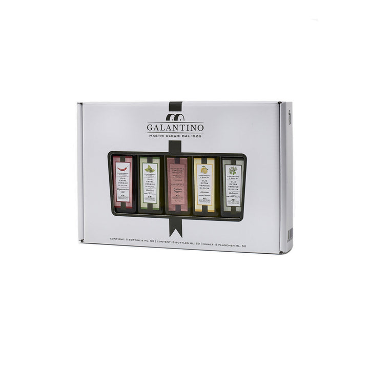 Galantino’s Taster Gift Pack of Flavored Extra Virgin Olive Oils includes 5 50ml bottles of award winning extra virgin olive oil packed in a gift box. Flavors include the hand-skimmed affiorato oil, spicy peperoncino, lemon, basil and aromatic herbs.