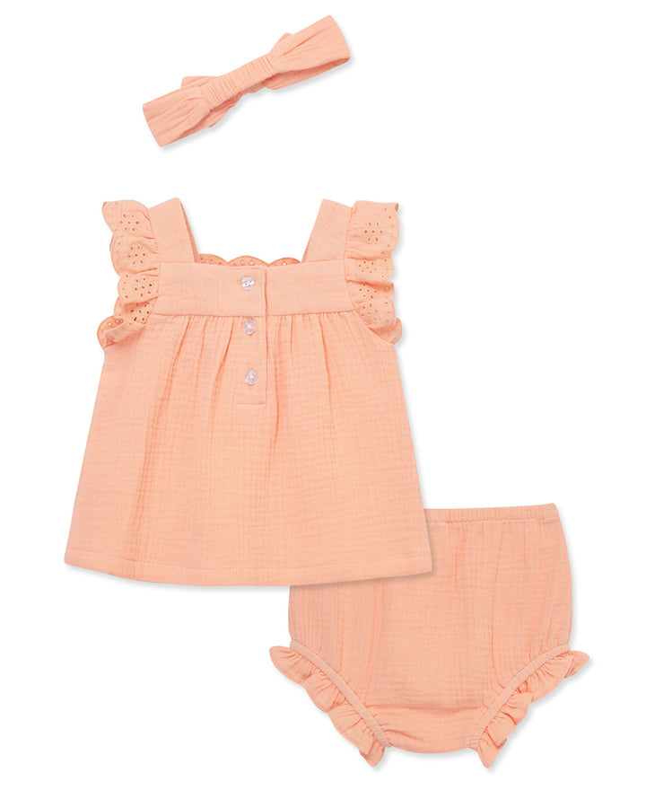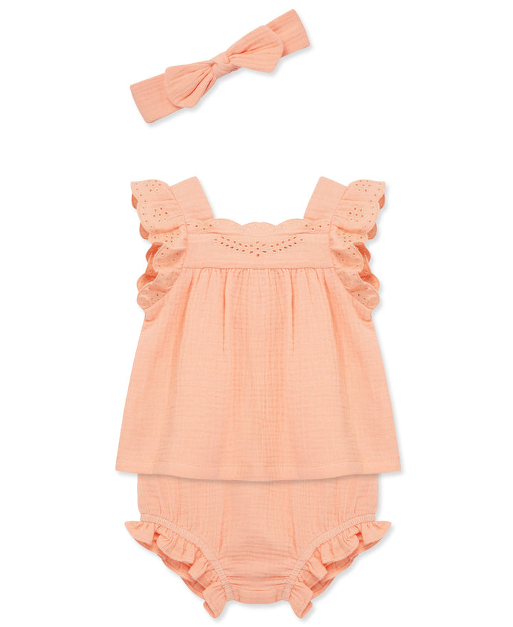 - She'll be pretty-in-peach eyelets this spring in our girls' cotton gauze 2-piece sunsuit set and matching headband!