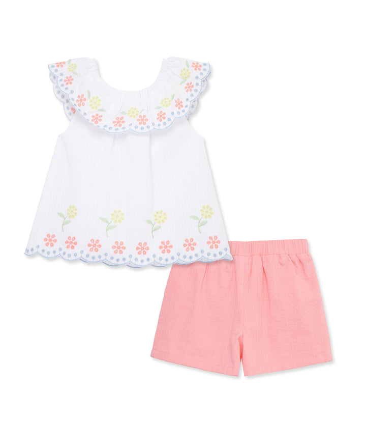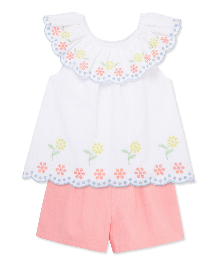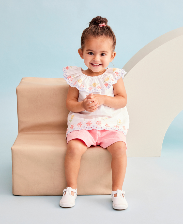 - Eyelets embellish this girls' woven cotton 2-piece play set, featuring the eyelet tunic and coordinating pink shorts!