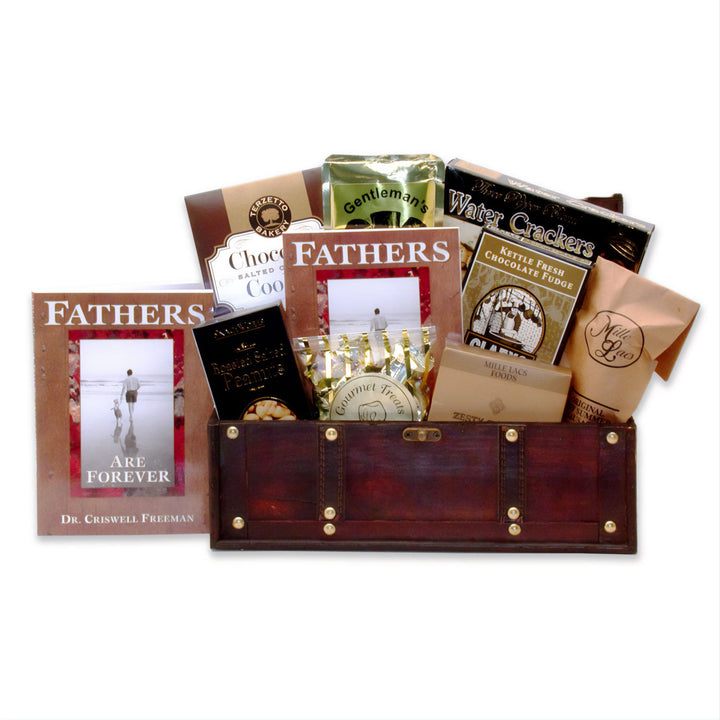 A gift basket especially for Dad! This solid wood chest for men bears a treasure of snacks and coffee to be enjoyed while Dad relaxes with the Fathers are Forever book which is featured in this basket. Any son or daughter can be proud to present Dad with this gift on his special day or anytime throughout the year! Show Dad how much you treasure his love with this treasure chest of treats!