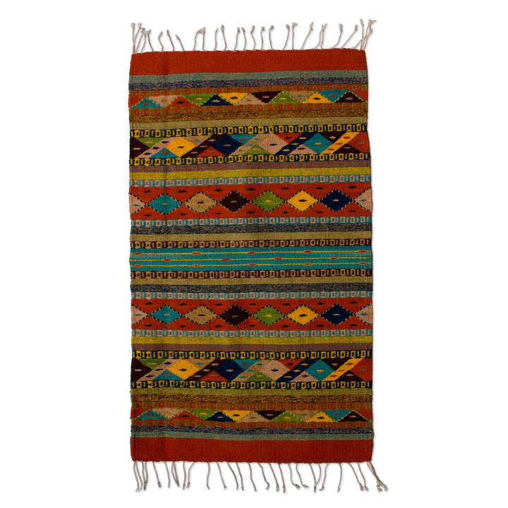Filled with the spirit of Oaxaca, this colorful Zapotec rug is inspired by the Sierra Madre, embracing ancestral diamond motifs. Alfredo Ruiz demonstrates Mexico's Zapotec artistry and his own weaving skills with this dazzling wool rug. Created of virgin wool on a traditional handloom, the accent rug takes its colors from natural dyes.