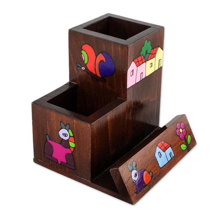 Flora and Fauna Wood Desk Organizer Pine Hand Painted El Salvador