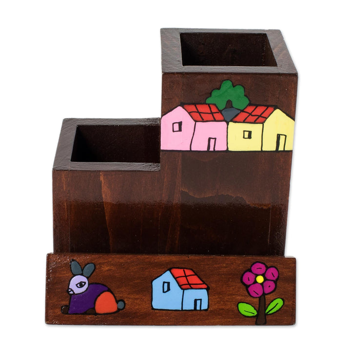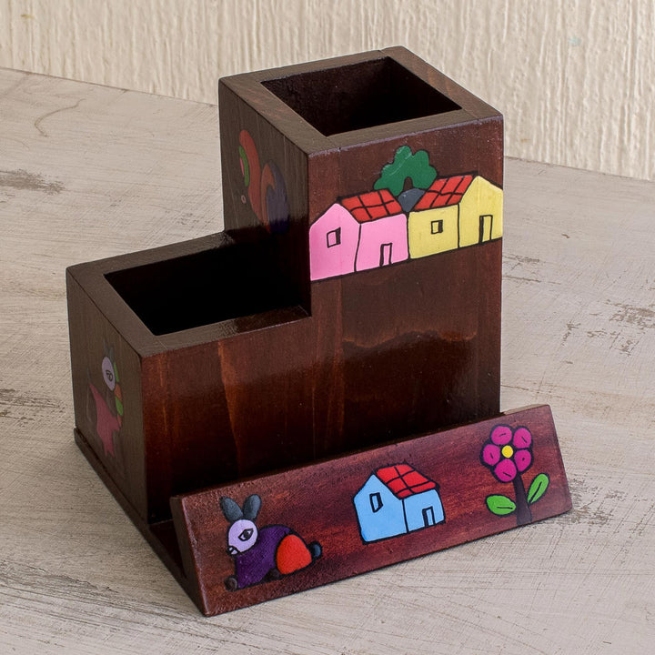 This pine organizer will bring whimsical character to any desk or office space! Hand crafted out of pinewood and varnished to shine, this box comes with two separate compartments for pens and pencils with an additional holder in front for business cards. Accentuating the attractive woodwork are hand painted pictures depicting daily life in El Salvador, the home of artisan Maria Estela Perlera de Portillo.