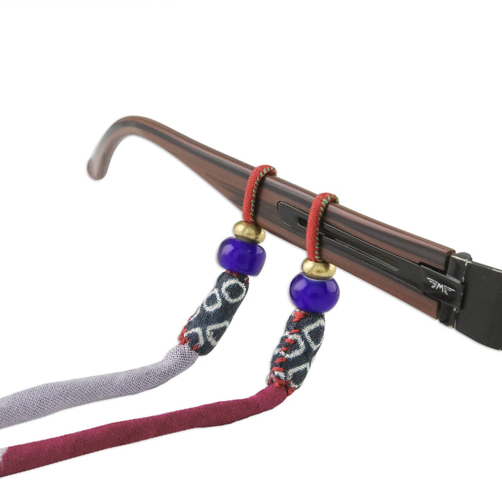 This cotton cord is comprised of a colorful Thai print. Spruce up your everyday spectacles with this charming eyeglasses strap, designed and crafted by Thanadol. Brass and glass beads anchor the cord, which is adjustable.