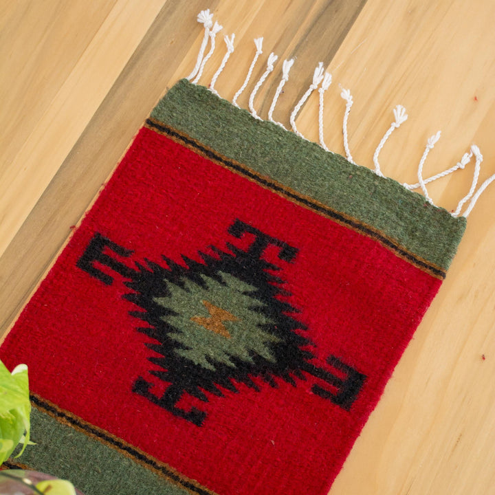 A narrow expanse of scarlet hosts medallions in forest green. Invoking the spirit of whispering trees, Gregorio Ruiz weaves an enchanting rug. He works with virgin wool on a traditional handloom. Titled 'Trilogia de Diamantes' in Spanish.