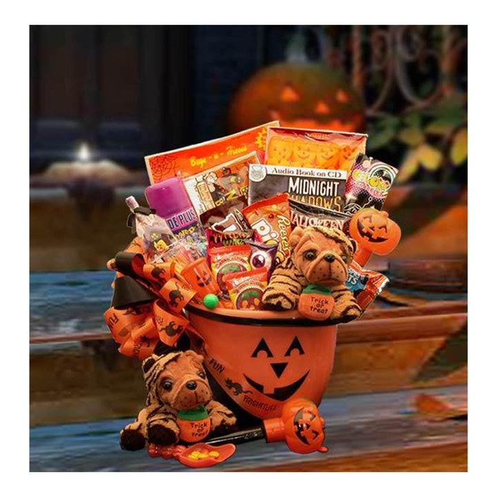An eerie fog rolls in and the full moon is on the rise—the mood has been set for a spooky surprise! Then the puppies arrive all dressed up and ready to play for Halloween. A plush pug faced puppy dressed in disguise delivers a spooky surprise pail filled with Halloween treats!