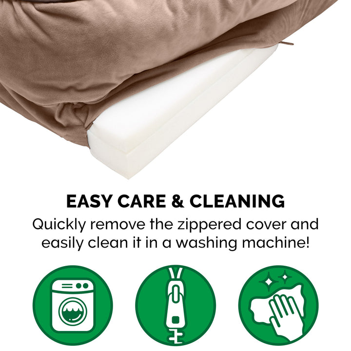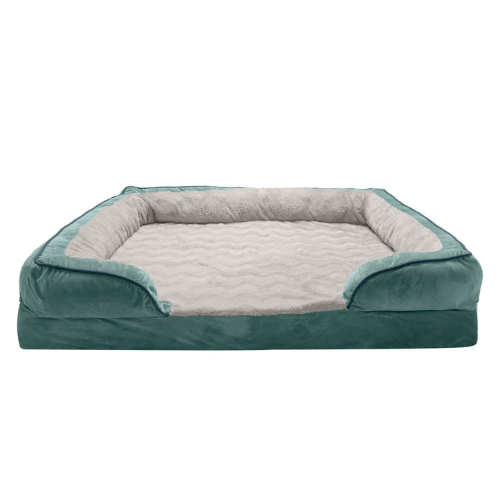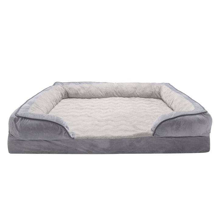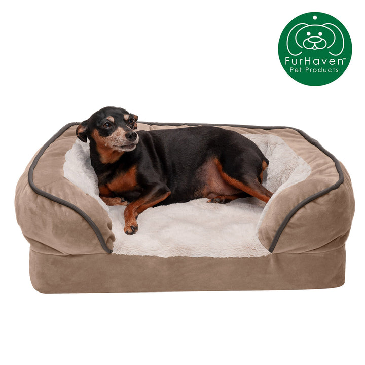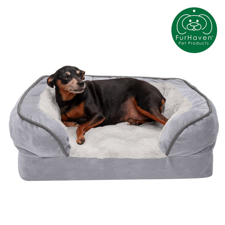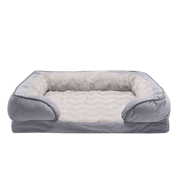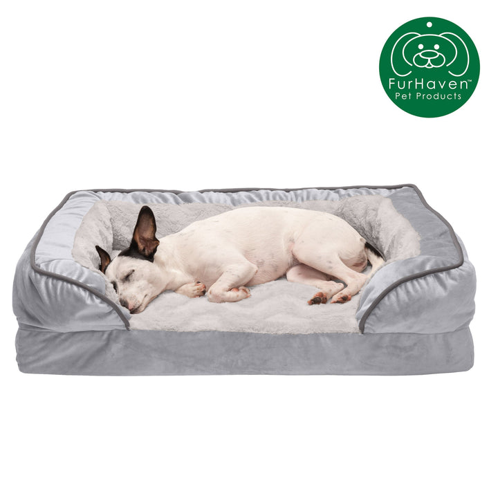 The FurHaven Perfect Comfort Sofa-Style Pet Bed takes dog beds and cat beds to a new level. Designed with oversized, pillow-y bolsters that wrap around the sleep surface, this luxurious bed is perfect for dogs and cats who crave coziness. Velvet-soft bolsters are lined with plush faux fur embossed with a classic wave pattern. The bolsters feature a fluffy, insulating filling for your pet's comfort. The solid orthopedic foam base supports your pet's joints and pressure points, making this pet bed ideal for arthritic pets who have trouble getting comfortable. This full support solid slab orthopedic foam provides even more support and comfort. Give your companion the luxury they deserve with this orthopedic dog bed. This bed features a zippered, removable cover to keep the bed fresh and washed. 100% Polyester Cover is made in China. CertiPUR-US certified foam core is made in the USA.