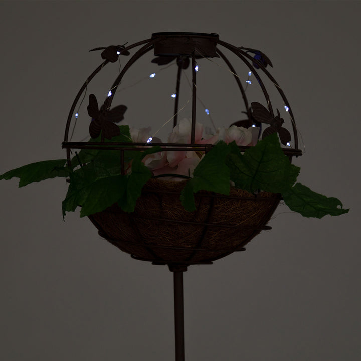 Turn your outdoor space into an ethereal place to relax! Easily stake this sphere planter into the ground with the solar panel in full sun to charge, and enjoy the butterflies or bees that flutter throughout the design! Topped with colorful faux flowers and greenery to enjoy during the day, and softly glowing LED lights that shine all night.