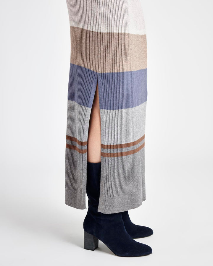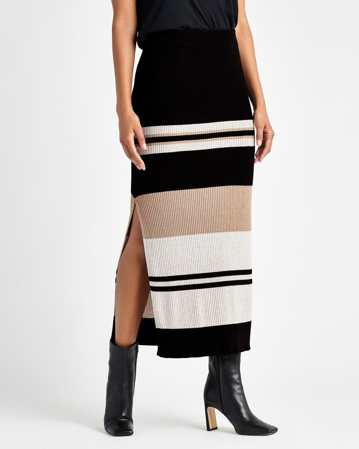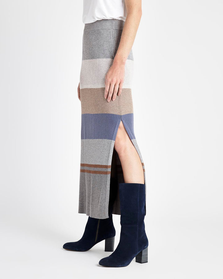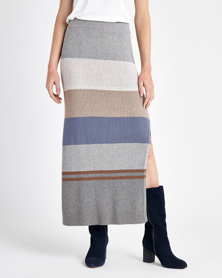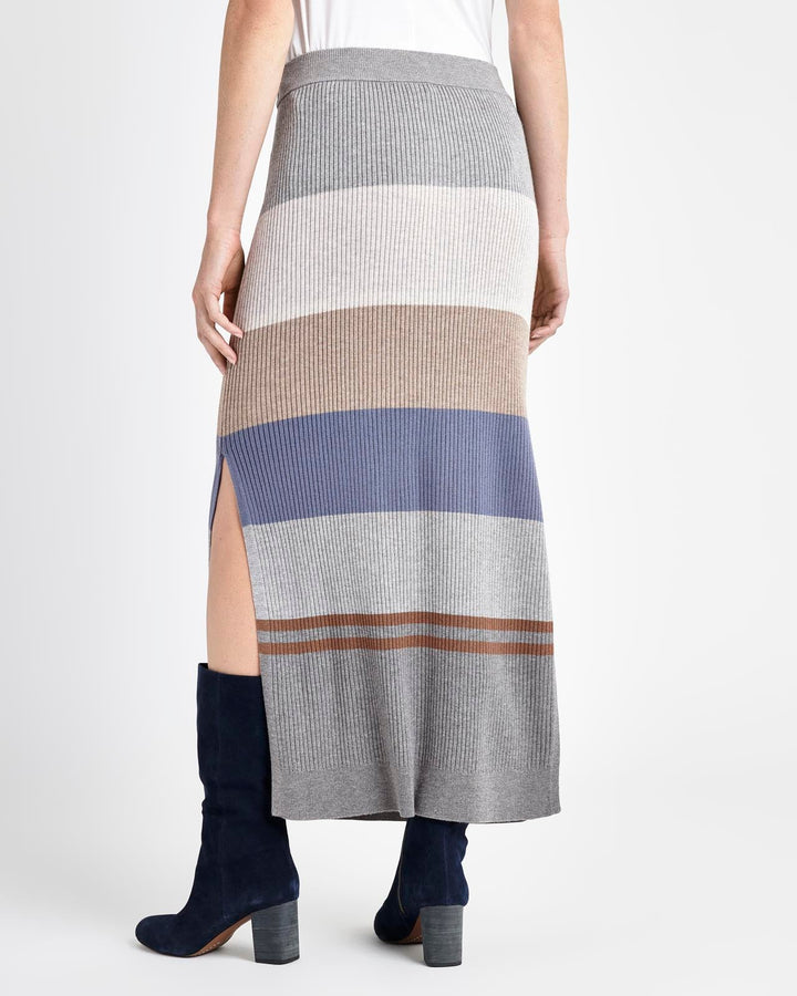 Our Georgie Rib Stripe Skirt is so soft and cozy, you'll never want to take it off. Designed in our Cashblend fabrication (a soft blend with a hint of cashmere), this colorblock stripe maxi skirt features a slide slit for easy walking and an elastic waistband for all-day comfort.