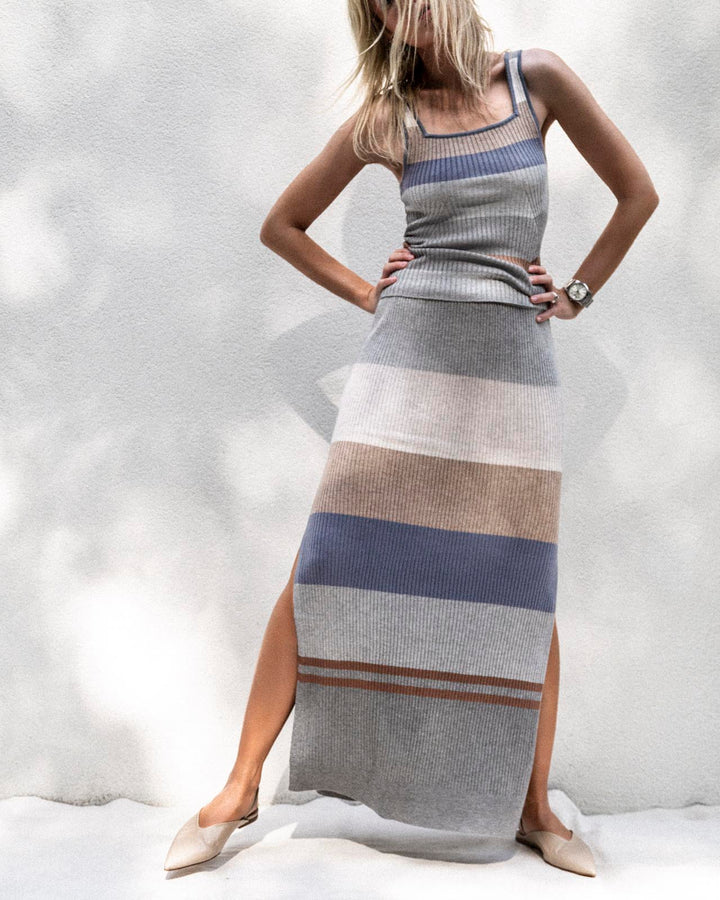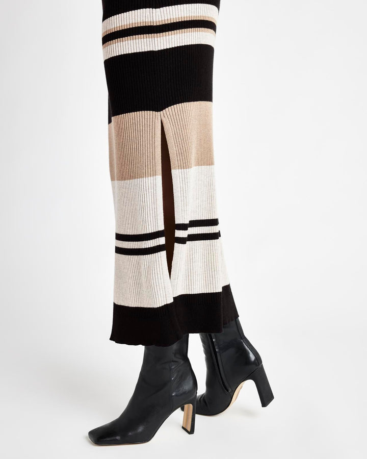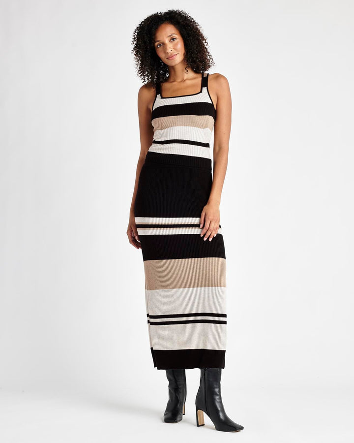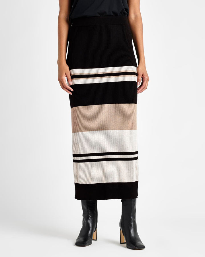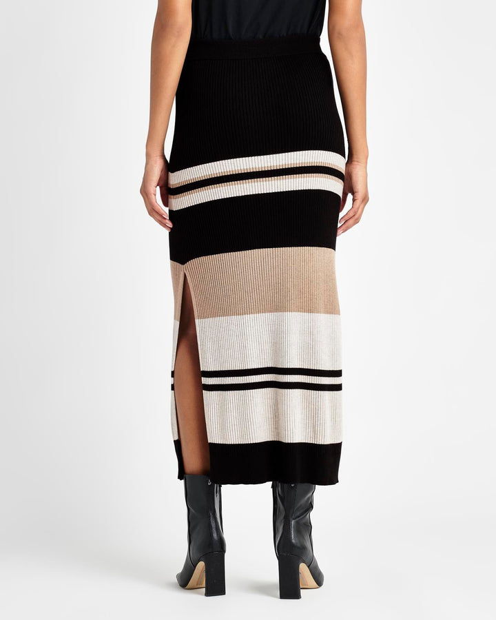 Our Georgie Rib Stripe Skirt is so soft and cozy, you'll never want to take it off. Designed in our Cashblend fabrication (a soft blend with a hint of cashmere), this colorblock stripe maxi skirt features a slide slit for easy walking and an elastic waistband for all-day comfort.