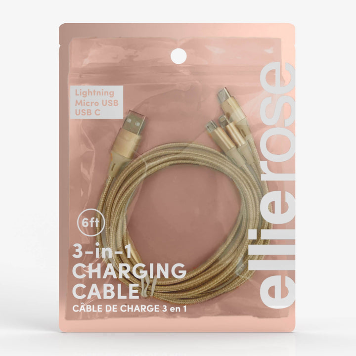 High-end 3-in-1 charging cable with Apple Lightning, Micro USB, USB-C connectors. These nylon casing cables are 6 ft long to give you that extra length while charging up.