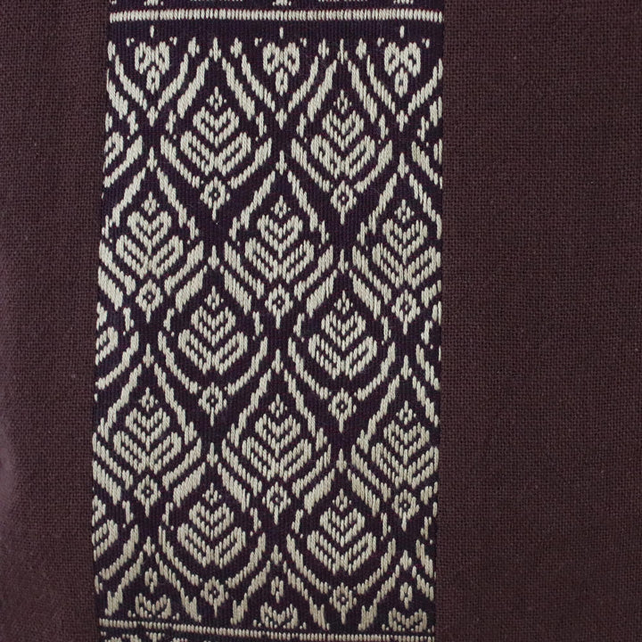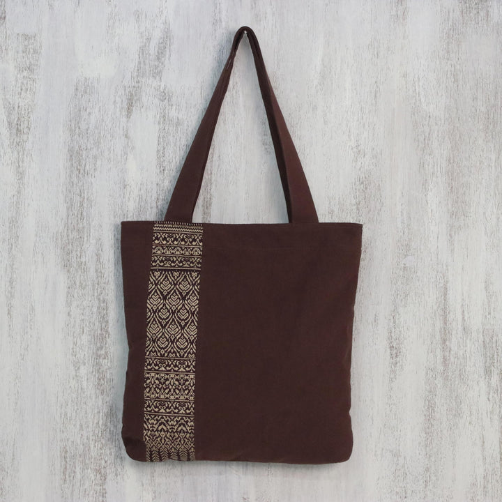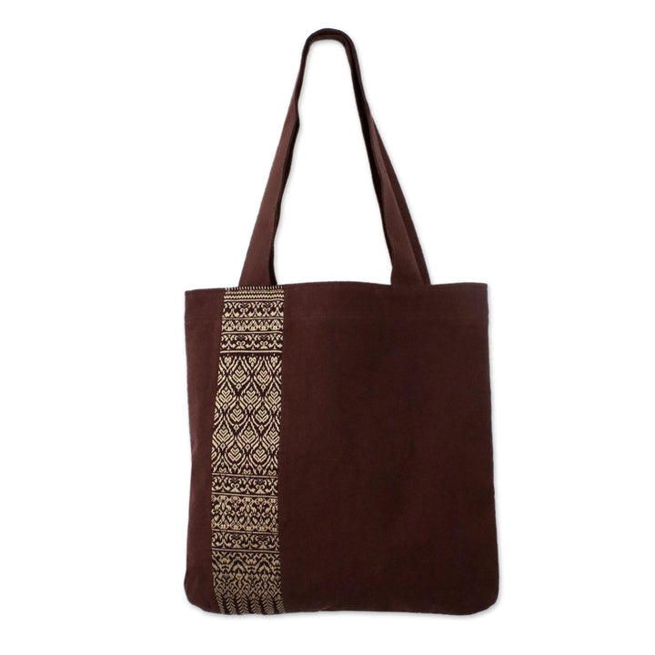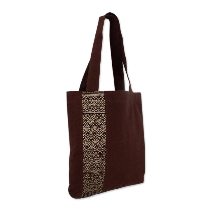 Golden lotuses trim the brown cotton textures of this handsome tote from Keawpankanlaya. Reminiscent of the ancient kingdom of Lanna, the Yok Dok brocade is woven on a traditional handloom. The bag's lined interior features an open pocket.