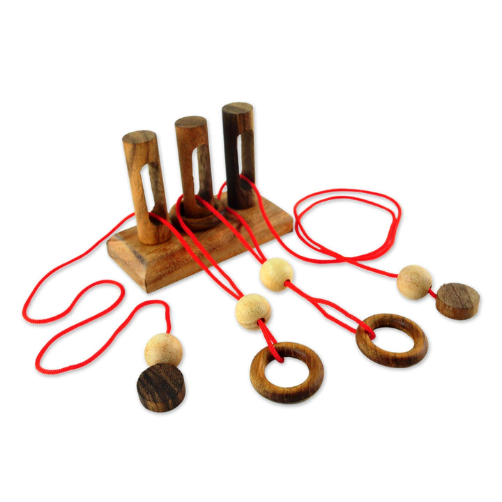 The goal of the entertaining puzzle is to completely remove the ring from the center gate. Artisan Waraporn Khamsuk of Thailand demonstrates his creativity with this puzzle that he handcrafts out of rain tree wood and rubber wood.