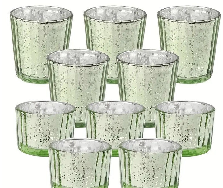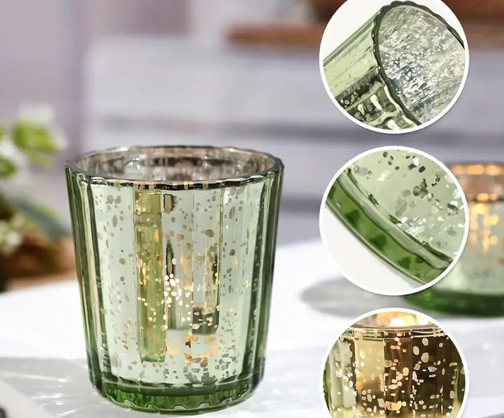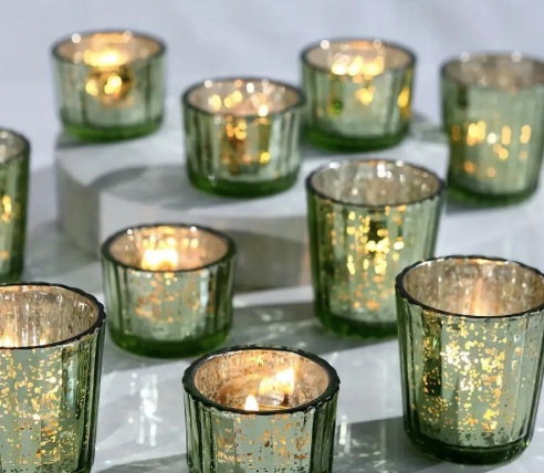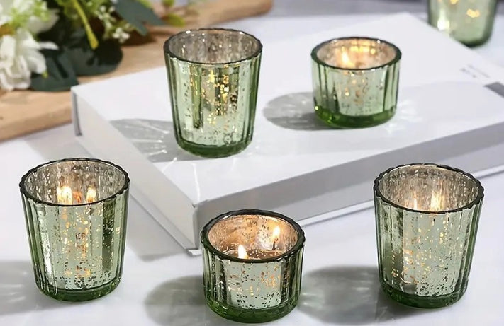 Mercury Glass Votive Candle Holders: Our 10 pcs Green Candle Holders feature a inner mercury coating that adds a touch of magic to your evenings. As the candlelight flickers within, these holders cast beautiful projections on your tabletop, creating a captivating and dreamy atmosphere that brings your party to a next level.