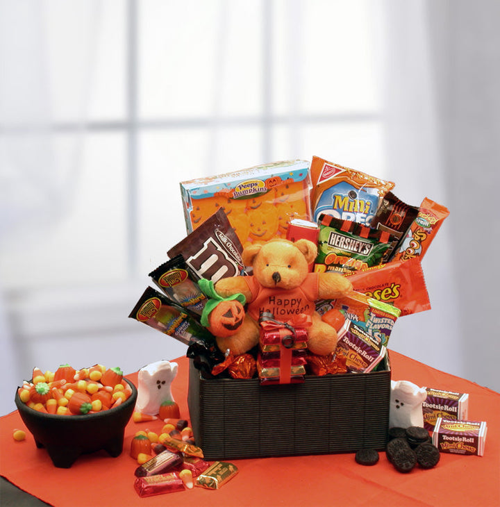 Tasty treats and cuddly bears fill this fun Halloween Goody Gift Box. Our little Happy Halloween Teddy Bear carries a festive pumpkin and is surrounded by a ton of scrumptious treats. The Halloween Goodies Gift Box includes: Peeps Marshmallow Pumpkins, Oreos Mini Halloween cookies, M & M's® Milk Chocolate, Reese's® Peanut Butter Cups, Hershey's® Marshmallow Cream Filled pumpkins, Nerds Candy Rope, Nerds Candies, Skeleton Gummies (2), Tootsie Roll Minis Box, Happy Halloween Teddy Bear, Hershey's® Miniatures assorted candy bars 6 pc, Miniature Kit Kat® Wafer Bar, Black Gift Box