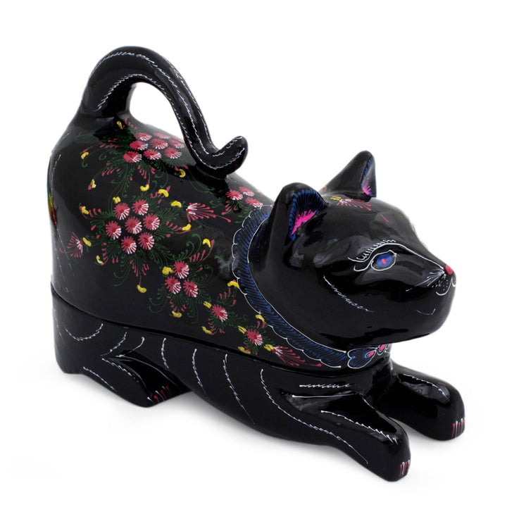Nantana Sompamitre transforms mango wood into a Korat or Si-Sawat (happiness) catAn adorable cat pounces playfully in this carved box by hand. The cat's tail curls over their back creating the handle for the lacquered box.