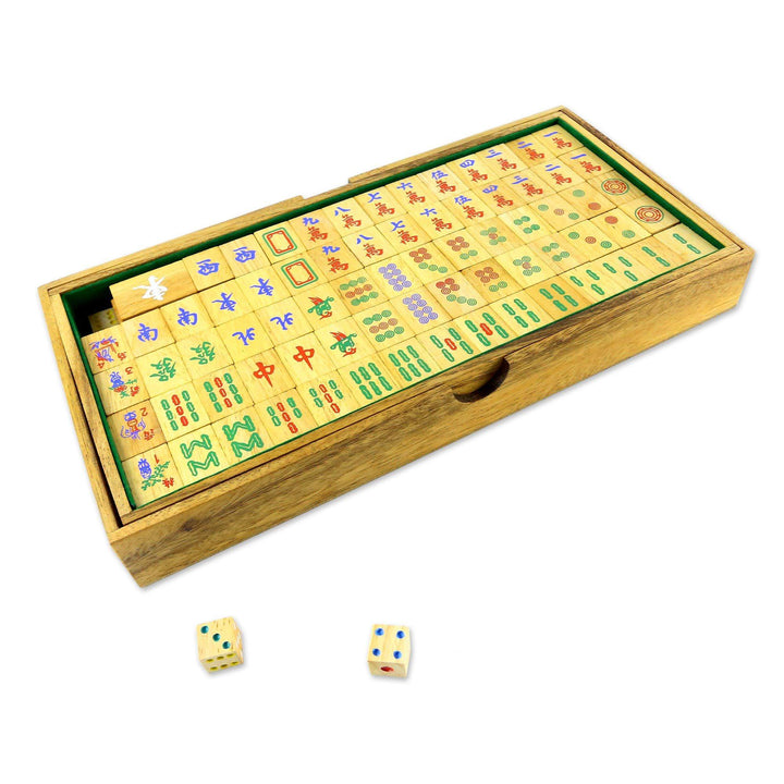 Raintree wood is painted with intricate characters by Thailand's Waraporn Khamsuk. This strategy game features 144 tiles painted with Chinese symbols in the traditional mah jongg style.