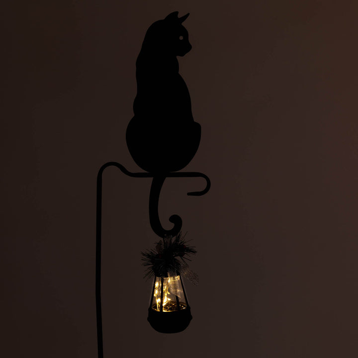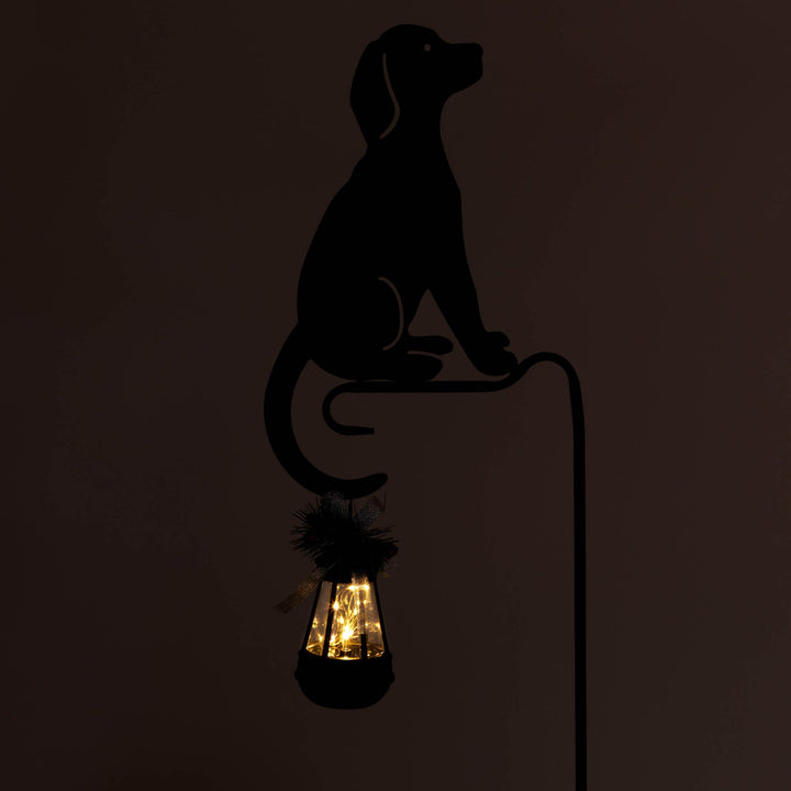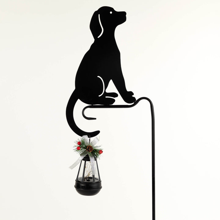 A lovable silhouette that lights the way! Each garden stake features a small lantern filled with twinkly solar powered lights that hangs from the curled cat or dog tail for a softly glowing decorative piece in your yard. Topped with holiday greenery on the lantern for a bit of winter warmth!