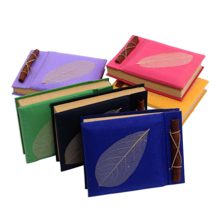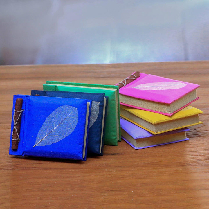 Decorated with lacy leaf silhouettes, six notebooks are covered in happy jewel-like colors. Komang Sulaksana creates each one with 50 rice straw pages. The covers are crafted of recycled paper and bound with agel grass cord tied around cinnamon sticks.