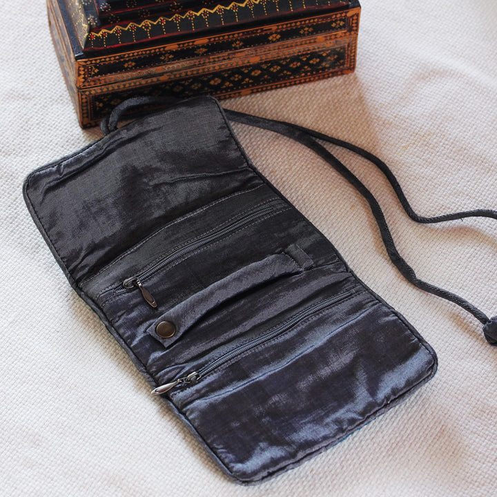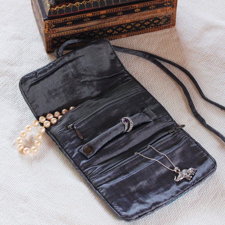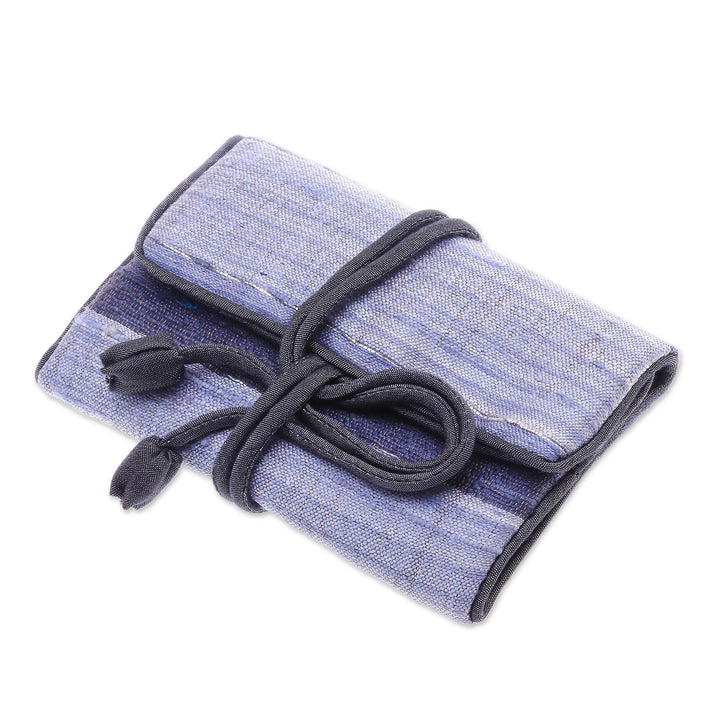 Handwoven by Thai artisan Vinita from an enticing blend of silk and rayon, this black and grey jewelry roll is both convenient and attractive. The grey interior features two small zip pockets, a large zip pocket, and a padded roll for rings. Two straps tie the jewelry roll closed.