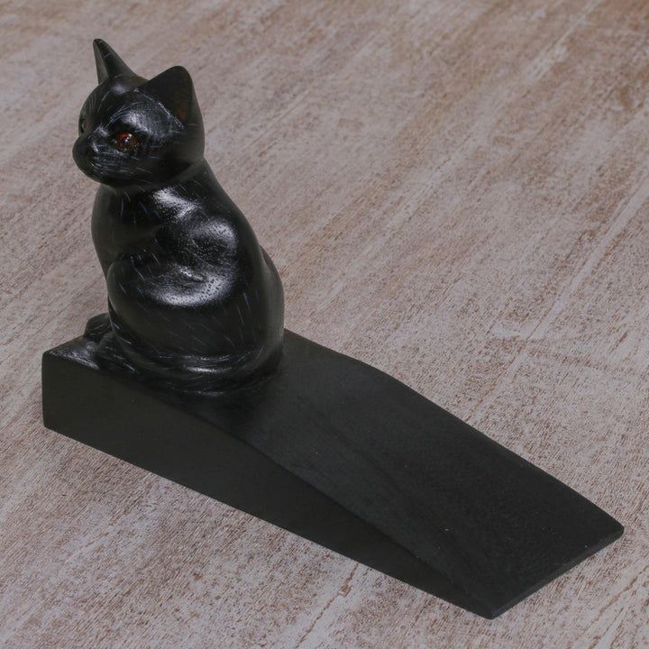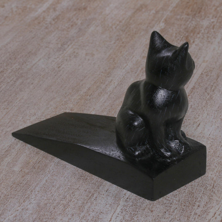 An adorably helpful kitten sits atop this doorstop. Designed by Nengah Sudarsana, the doorstop is handcrafted of local suar wood and painted black.