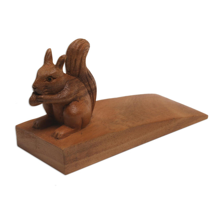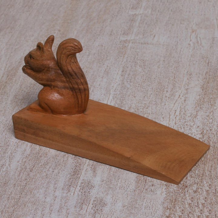 Topped by a helpful little squirrel, this Balinese doorstop is handcrafted of local suar wood and given a natural finish. Designed by Nengah Sudarsana, this decorative accent makes a charming addition to your home.