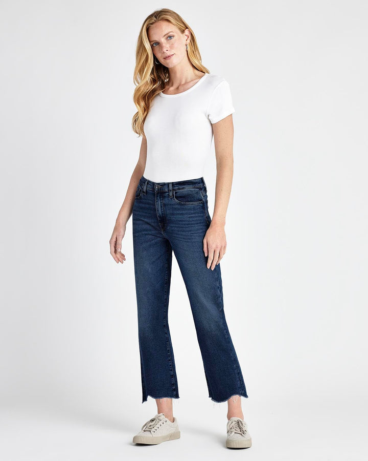 Designed with a cool flare that hits at the ankle, the High Waisted Raw Hem Stretch Jean is a modern staple. This true-blue version is crafted with a vintage-inspired distressed hem. Style with a cozy knit and sneakers for a casual look.