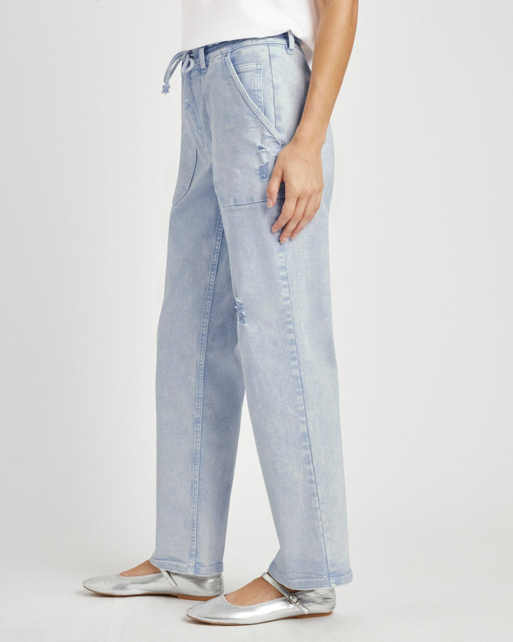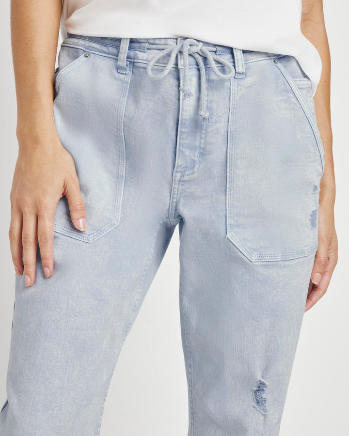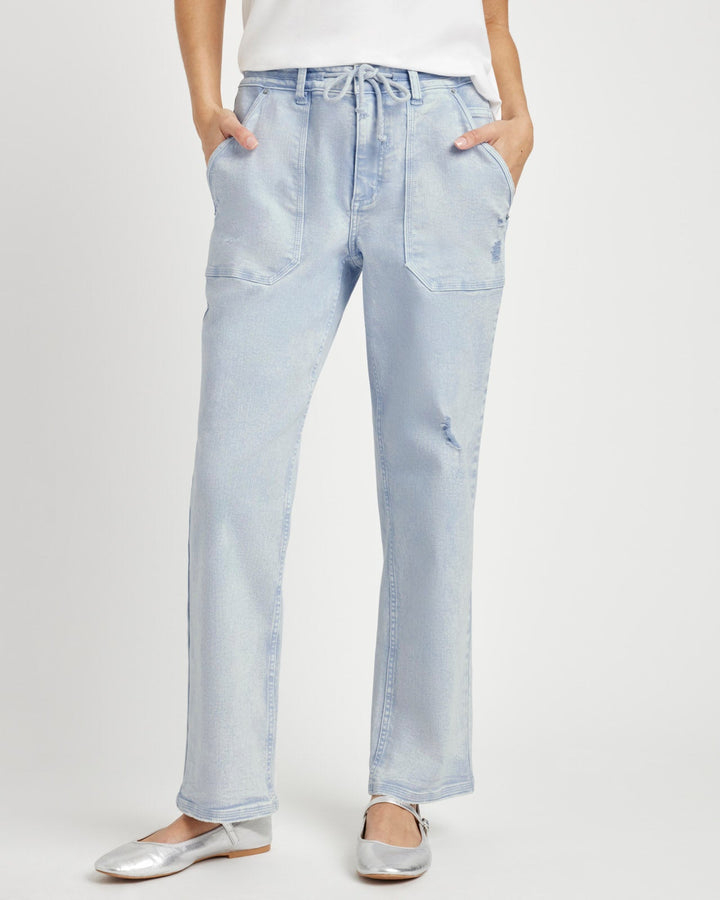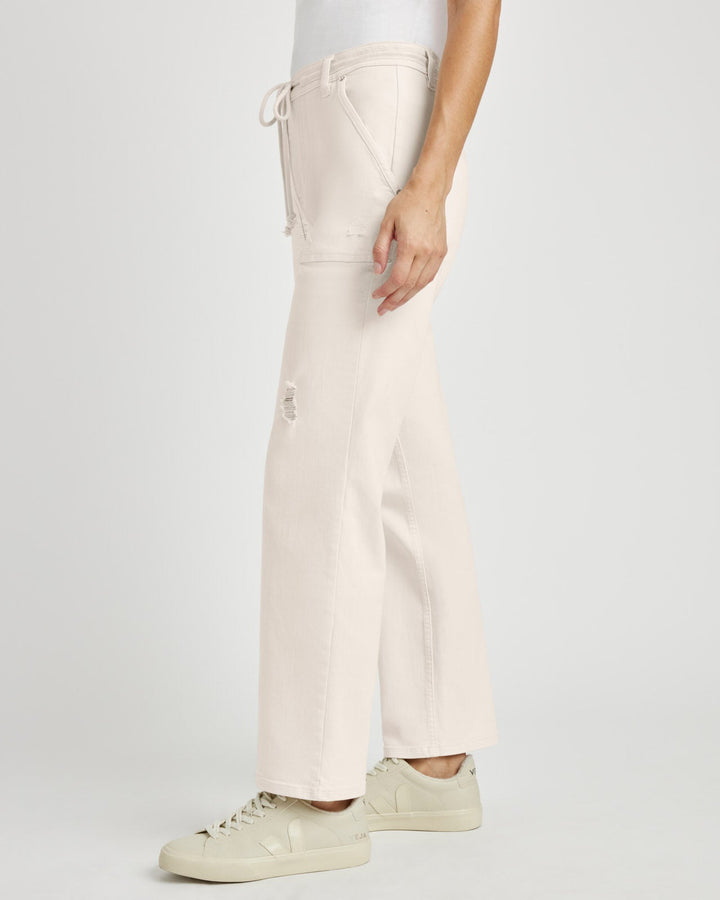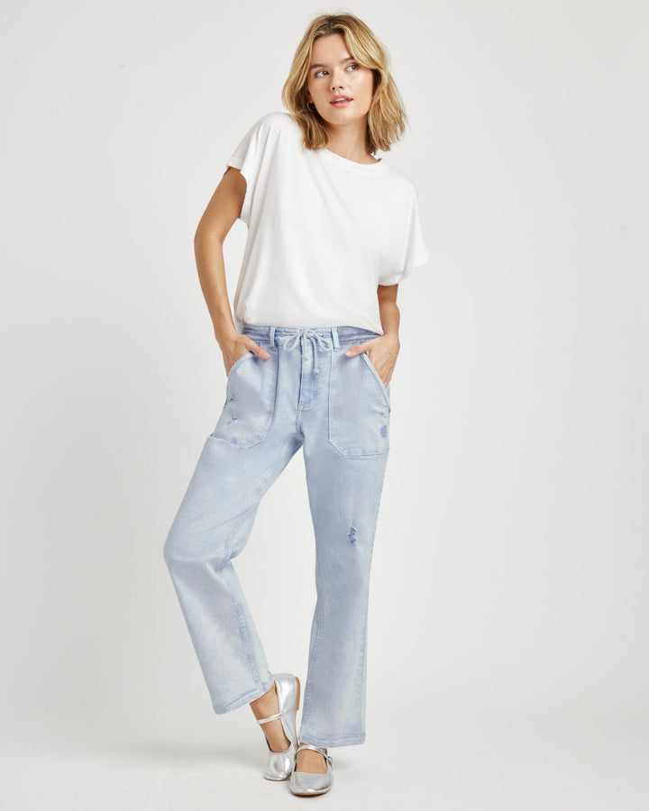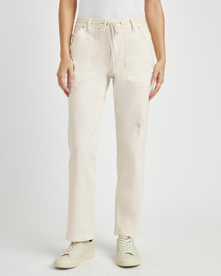 Somewhere between a great pair of jeans and a lounge pant lies our Hudson Pant-- a twill pull-on pant with a drawstring waist and an acid wash finish. It has belt loops and a relaxed leg with a little distress detail for a lived-in look.