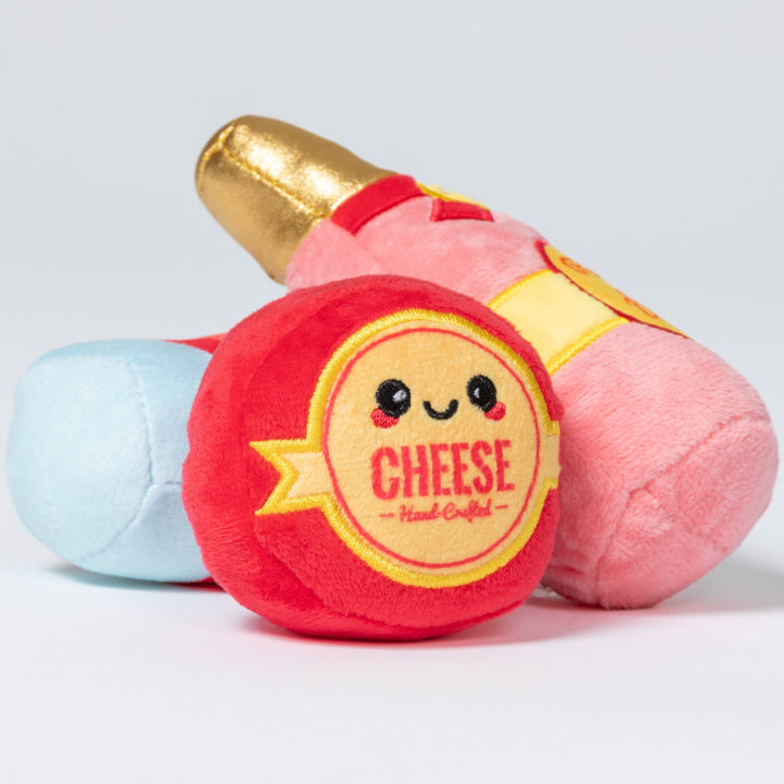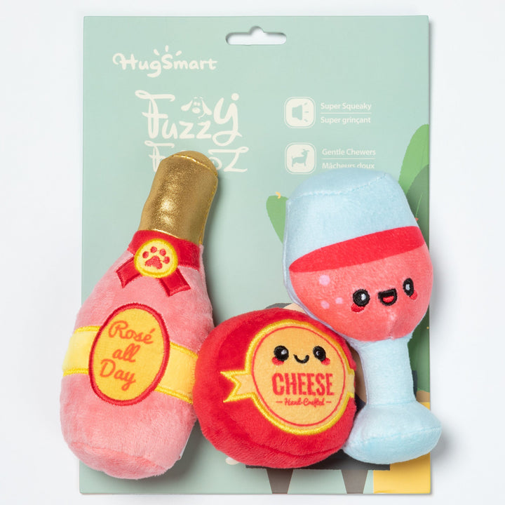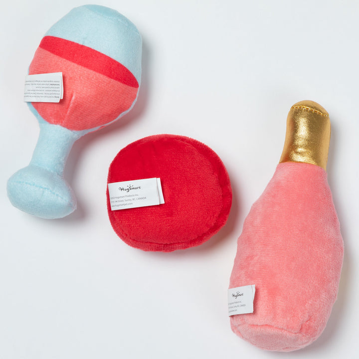 The HugSmart Picnic Time Dog Toy is a multi-part toy. Includes a plush wine, happy glass, and cheese. Designed for small to medium dogs. These toys will surely spark your dog’s fetching instinct. Loud squeaks and adorable design invite active indoor play. The soft plush body is great for snuggling. Enjoy this picnic season with your pup!