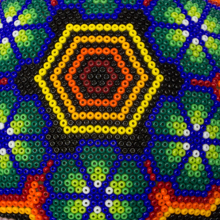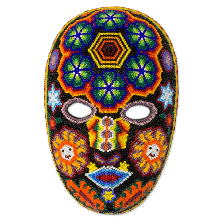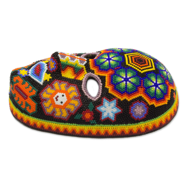 Hernández depicts the peyote flower on the mask's forehead; the cheeks glow with images of the sun god. Two terukas scurry from the chin; these scorpions guard the maize. He celebrates Huichol custom with this mask as he finds inspiration in the psychedelic effects of jicurí ('peyote flower'). Ingested only for ceremonial purposes, jicurí is regarded as a sacred flower for it allows a person to see and communicate with the gods.
