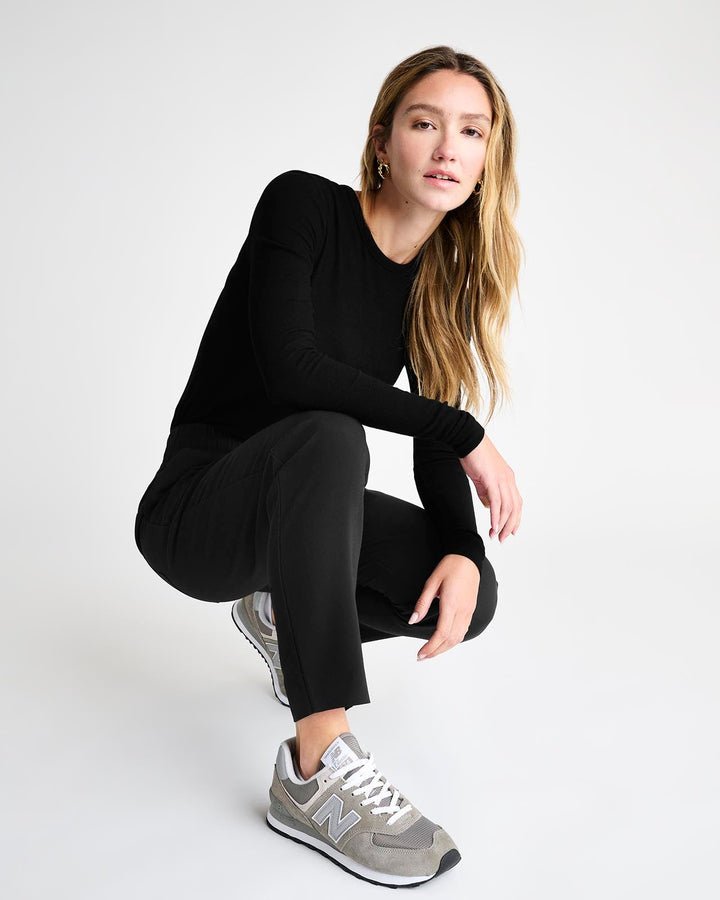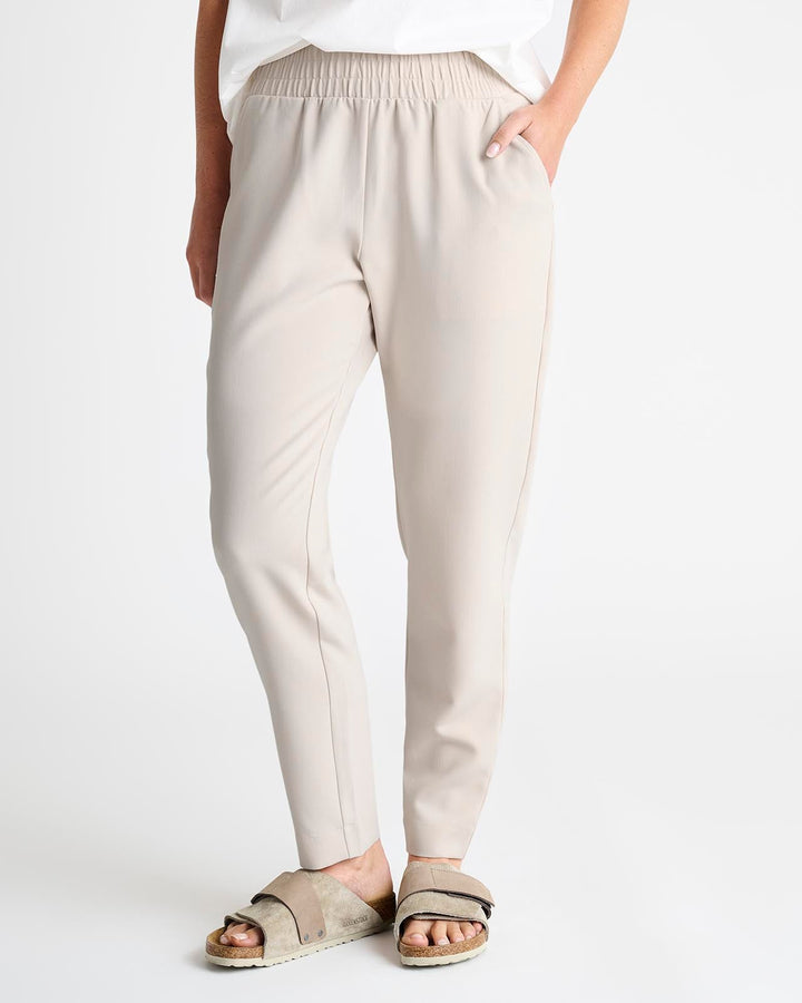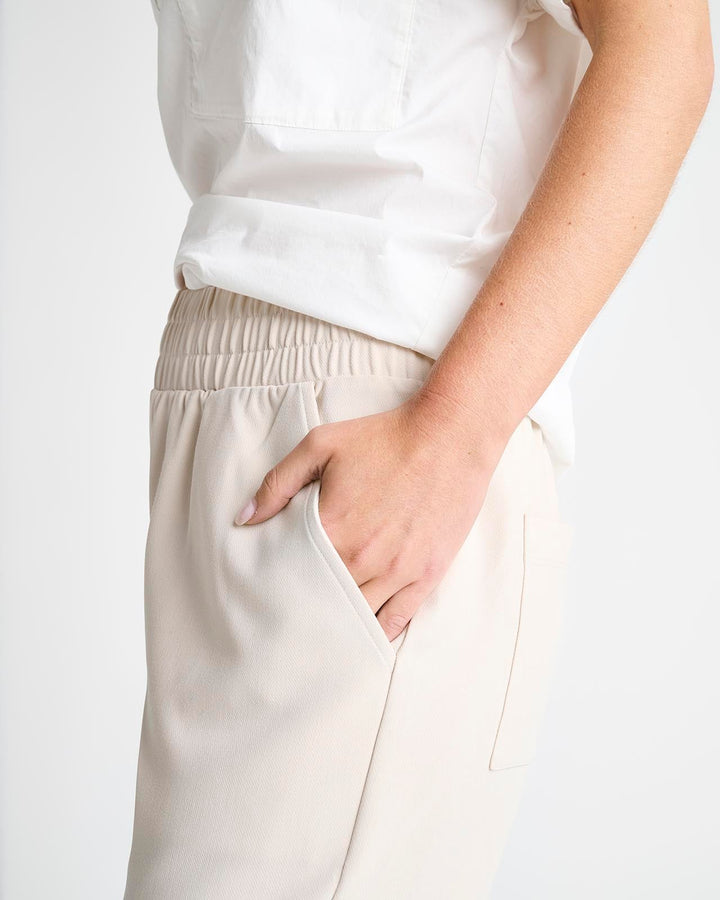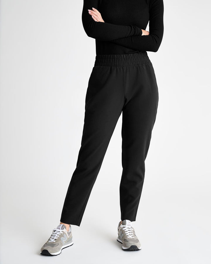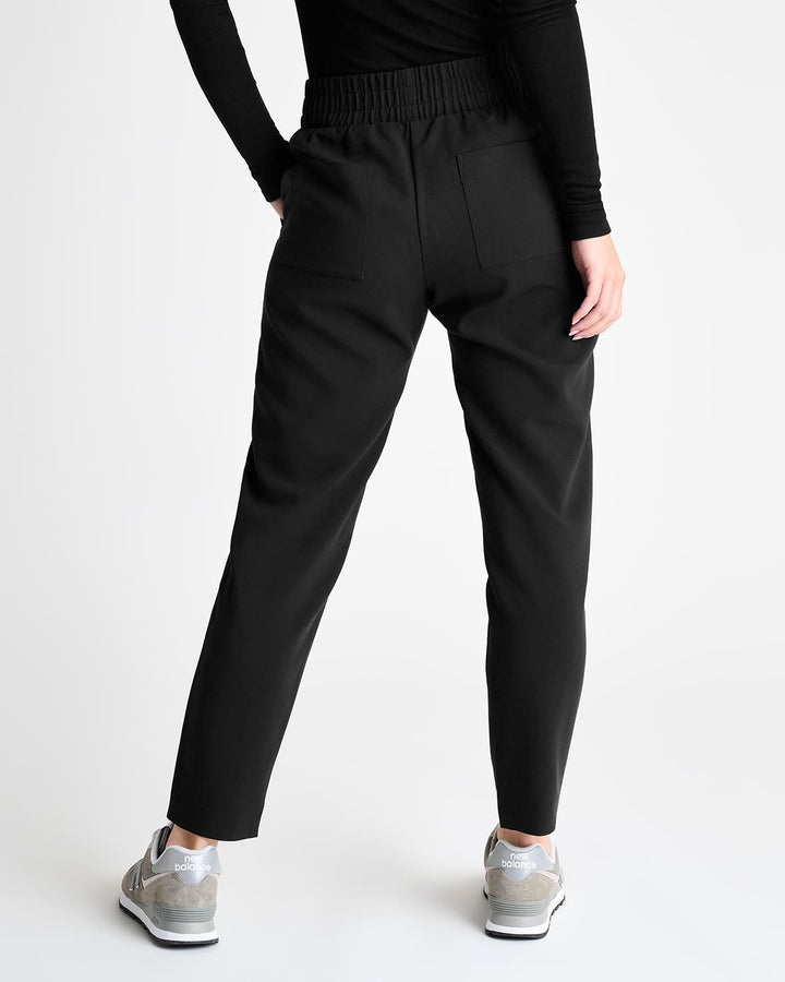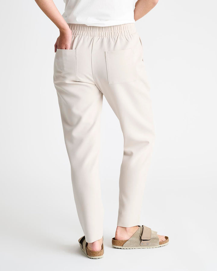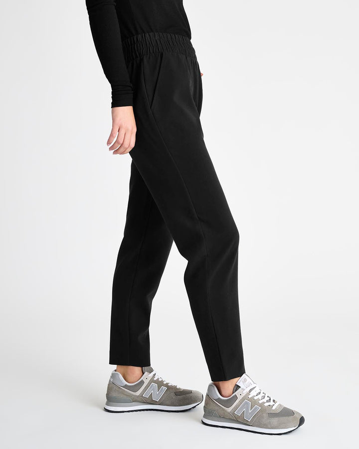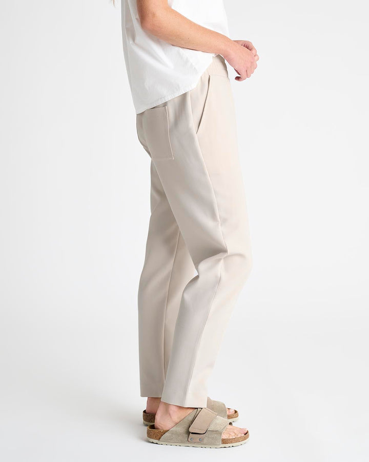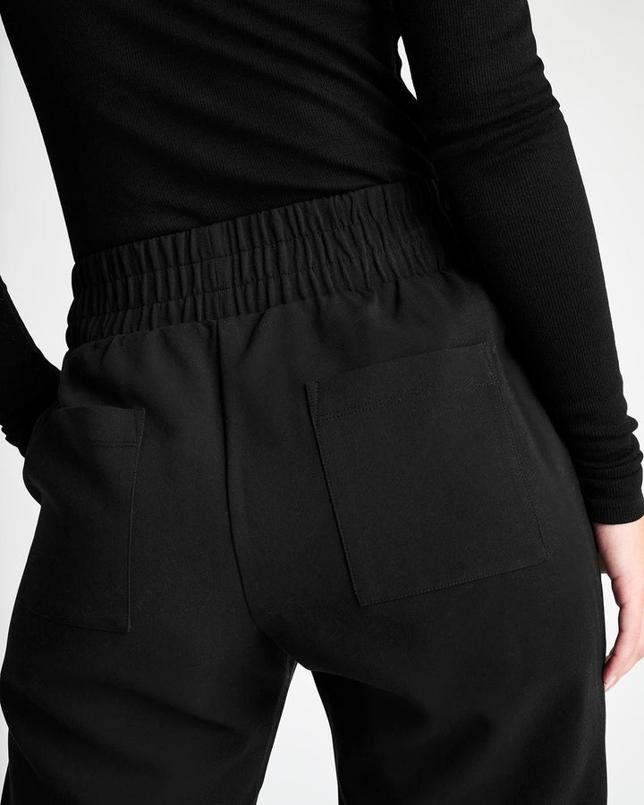 An elevated pant for your more polished moments. Made from woven twill, it provides a more structured feel with a sophisticated straight leg that hits at the ankle. It features a thick elastic waistband, slash pockets and back pockets.