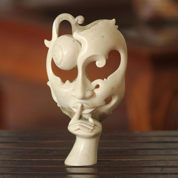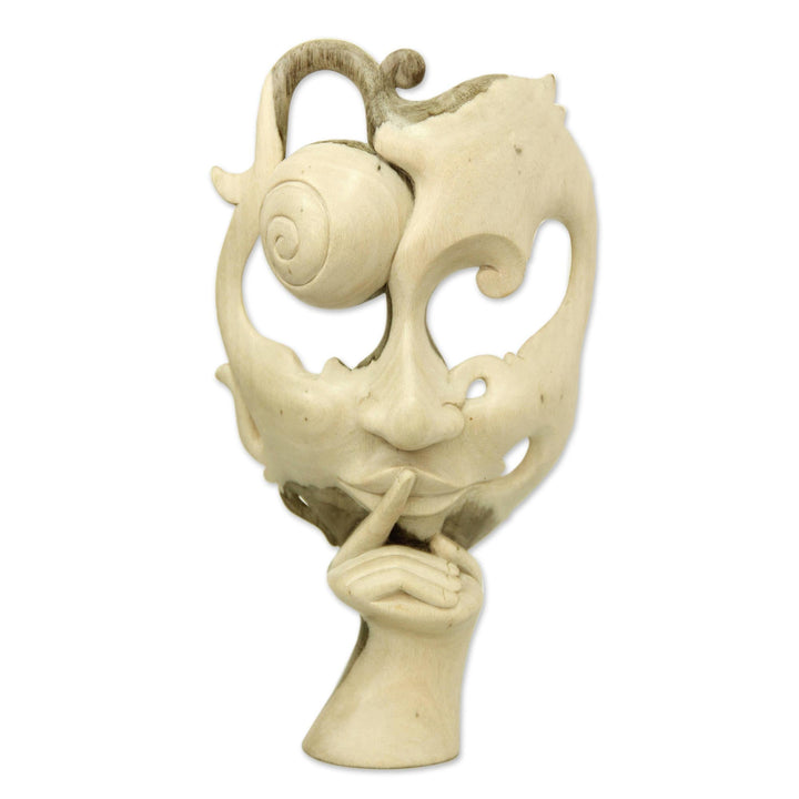 A mysterious damsel requests quiet, by lifting a finger to her lips. This elegant Balinese mask is superbly carved by hand. From Eka, it showcases the unusual grain of natural hibiscus wood. This wood varies widely in its tones and patterns, thus each mask is an absolutely unique work of art.