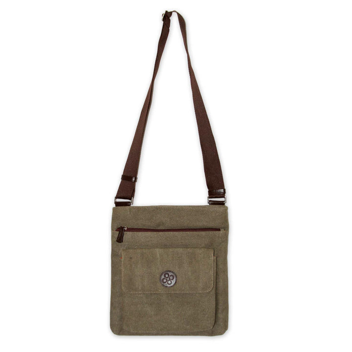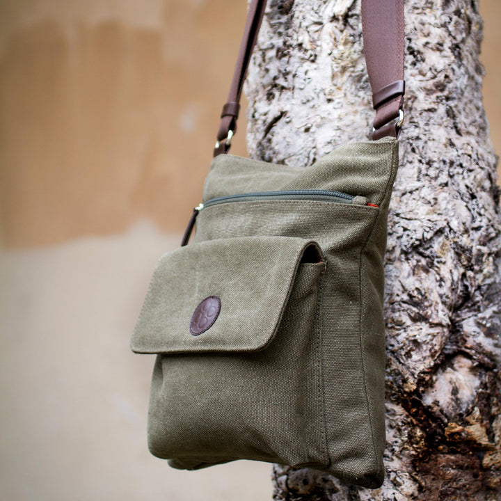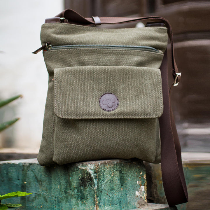 Karina and Maybeé bring superior elegance to the design of this messenger bag. Sewn of green cotton drill, the bag is trimmed with subtle leather accents. The practical bag features two lined zipper-top compartments, as well as a button-top pocket. This one has an interior pocket as well as three slots for pens and pencils.