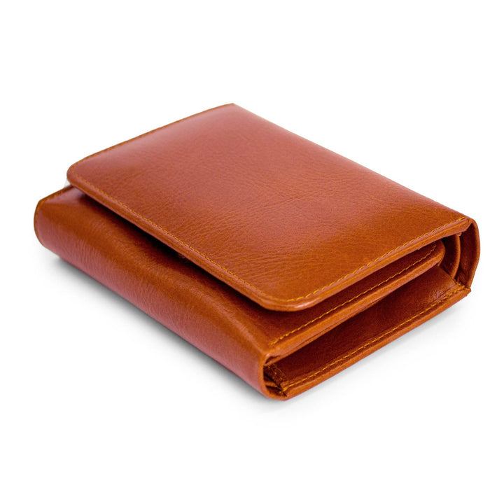 This trifold wallet by Achara Boonfu is elegant and highly practical. Crafted of dyed brown leather with a light yellow lining, the wallet includes eight credit card slots, a clear ID window, three multi-purpose slots, a compartment for bills and a snap button coin pouch. There is one more slot in the exterior.