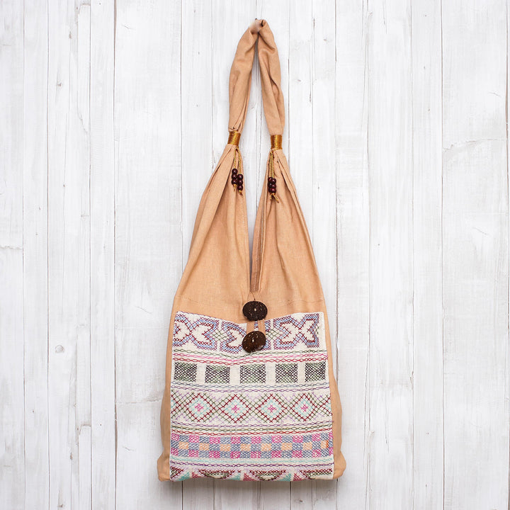 Embroidered hill tribe motifs reveal the legendary textile traditions of the Akha people. The patterns cover a generous front pocket on a cotton sling tote. By Jiap Rojjana, the bag is fully lined and an inner pocket with zipper keeps small items handy. Golden cords and rain tree wood beads adorn the strap, and both the outer pocket and the purse close with coconut shell buttons.