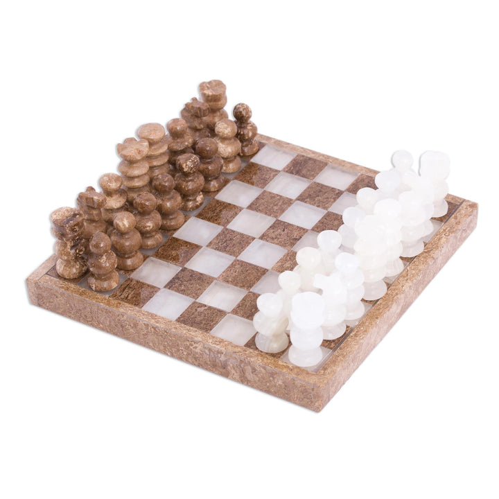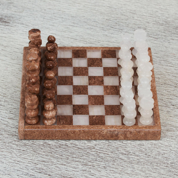 The perfect home accessory for offering a cerebral challenge, this mini chess set from Mexico is presented by the Sierra Family. The artisans work with onyx and marble, diligently hand-carving each tile and chess piece to display natural hues of brown and ivory. The chess set's petite size makes it the perfect home accessory for any space.