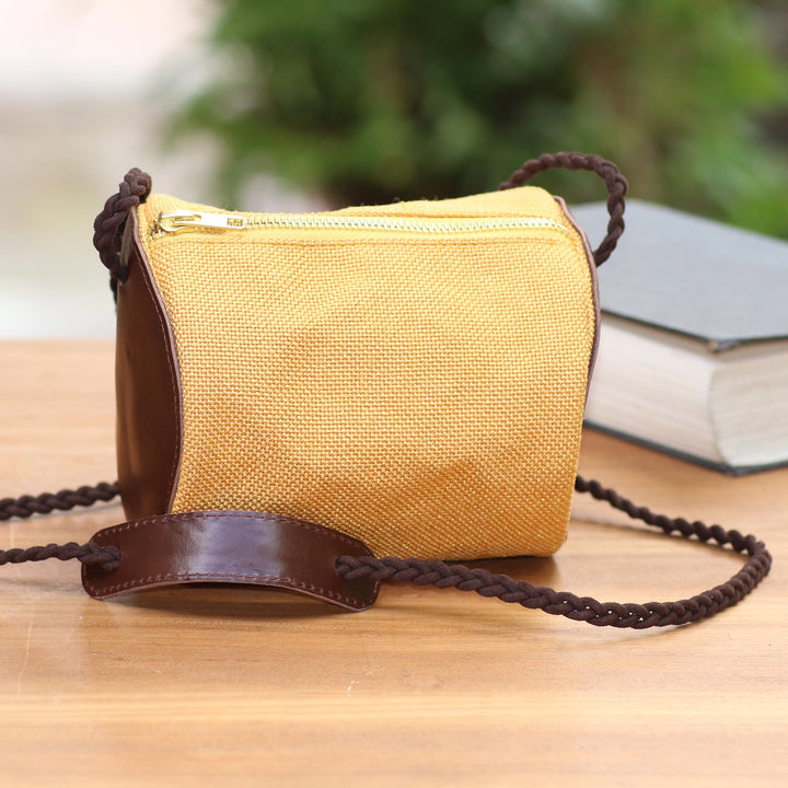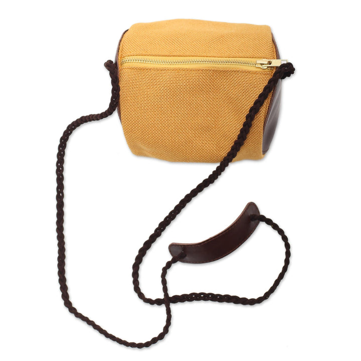 Crafted of mango-hued woven cotton and trimmed with dark brown leather, this petite barrel-shaped sling is designed by Javanese artisan Nell. The bag is fully lined in polyester with one open pocket inside for keeping small items close at hand. A braided suede cord allows you to carry the bag comfortably on your shoulder or cross-body.