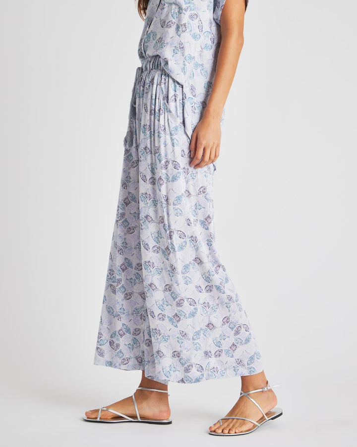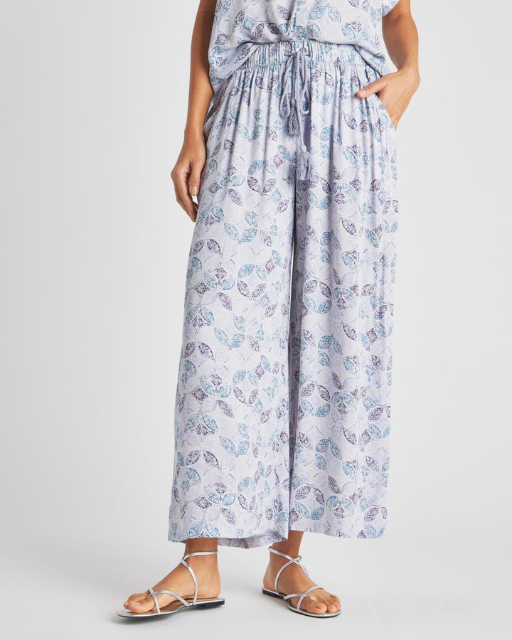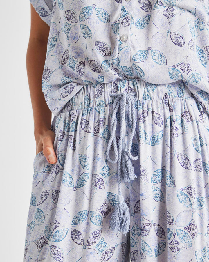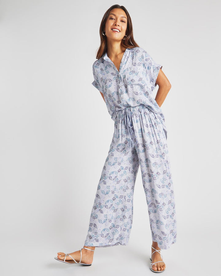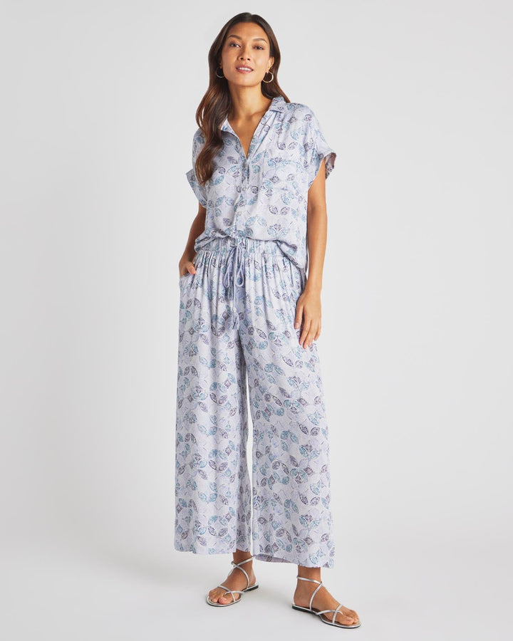 The charm of our Lainey Cropped Wide Leg Pant is undeniable. Made from sateen with a spring print, its voluminous wide leg is topped with a drawstring waist with playful tassel ties. Top it with the matching Kathryn Short Sleeve Shirt.