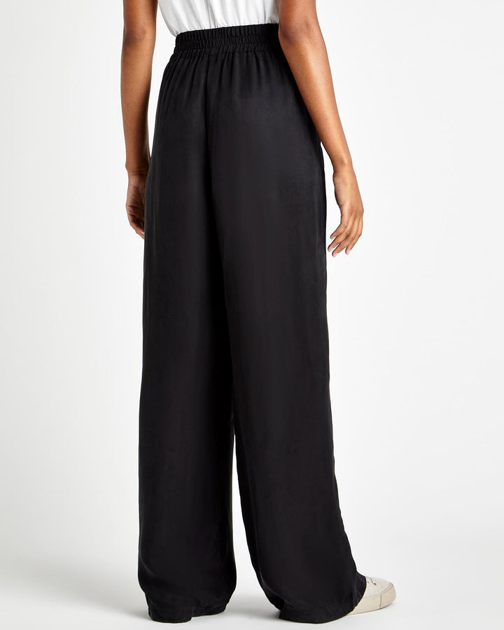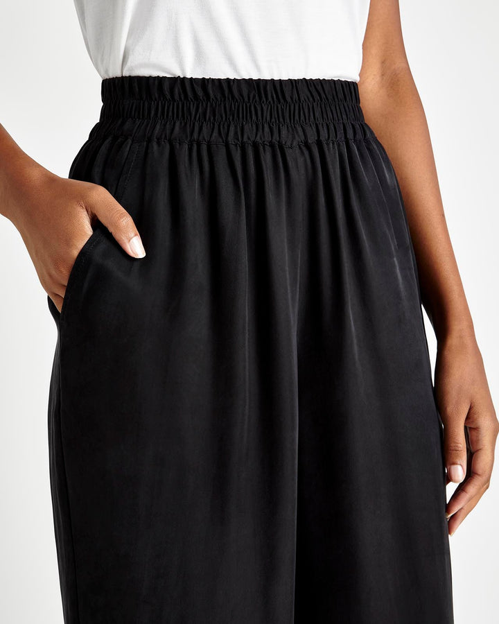 Crafted from sandwashed cupro, this silky pant will be your go-to this holiday season. Its lightweight fabrication looks and feels like silk (without the high maintenance care). The stretch waist, wide leg and side pockets make it so easy to wear. Plus, it pairs with anything-- wear it with a tee, a sweater or a sparkly top.