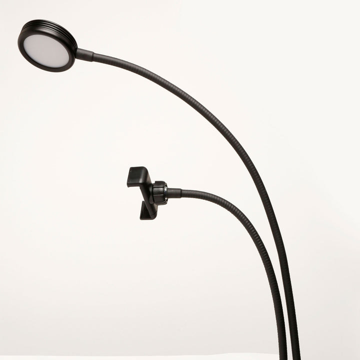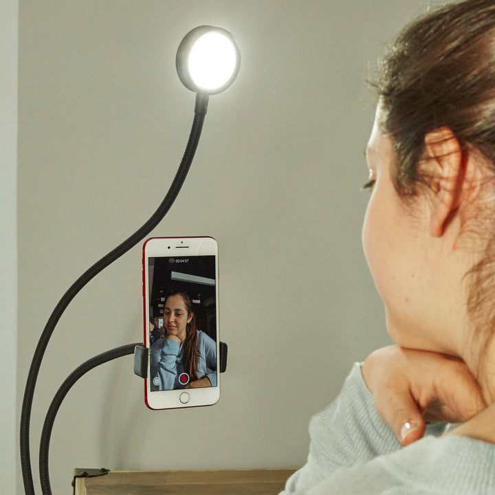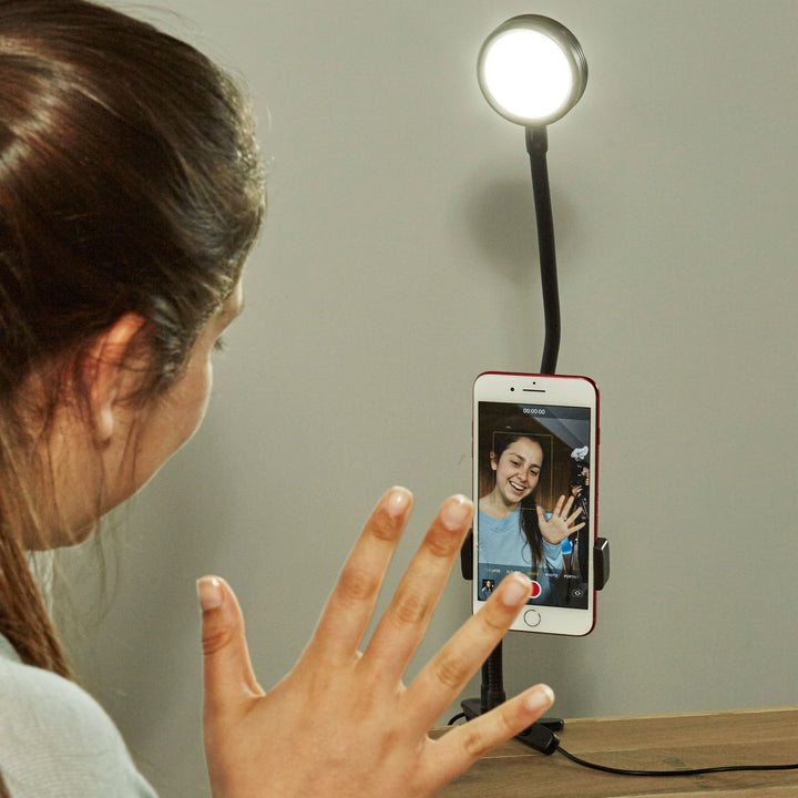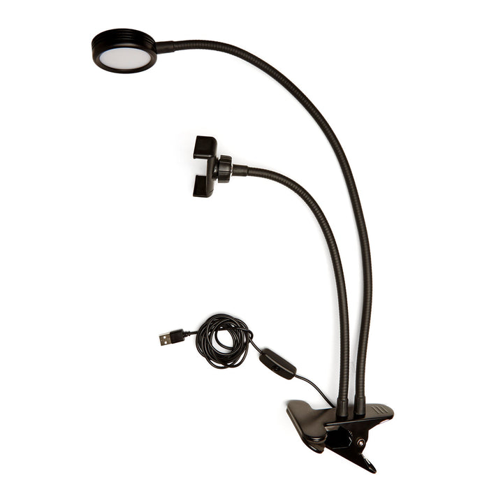 Make live streaming a breeze! This kit includes a 2 in 1 universal phone holder and USB powered LED light with 3 brightness settings that easily clamps onto a table.