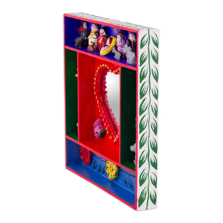 Alejandro Chavez crafts a mirror frame rooted in the Andean tradition. Known as a retablo, this traditional diorama is housed in a colorful chest crafted of plywood and painted. The Peruvian artisan carefully models each figure from ceramic plaster and paints them by hand to surround a heart-shaped looking glass.