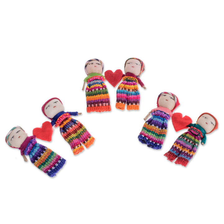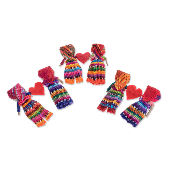 The set consists of two pairs of male and female worry dolls joined together by a red heart. Handmade, the dolls are dressed in vividly-colored traditional Guatemalan attire and arrive in a pouch of handwoven cotton fabric.