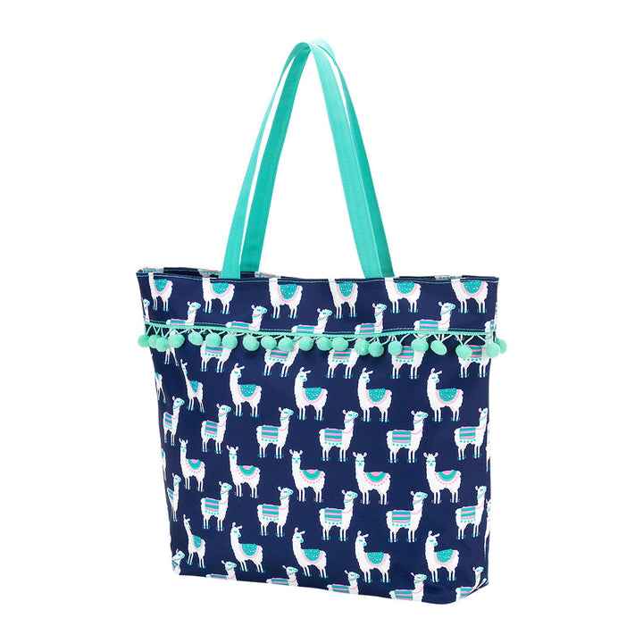 Seems like llamas are the new craze these days. This is a fun print tote, that has a cute teal pom-pom trim. Carry all your essentials, use as a day tote or for a sleepover bag.