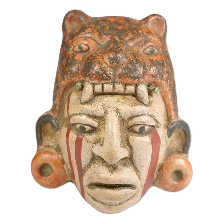 A cat headdress pays tribute to Chaak Balam, the 'Grand Jaguar' of the ancient Maya pantheon and a symbol of power. By Oscar Rodolfo Mendoza, this dramatic mask depicts an ancient Maya of noble standing, perhaps a priest or king. Modern artisans utilize the same materials and techniques as in pre-Hispanic times, achieving the red, yellow and orange colors from annatto seeds.