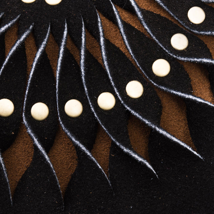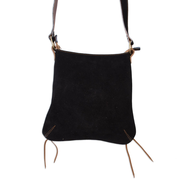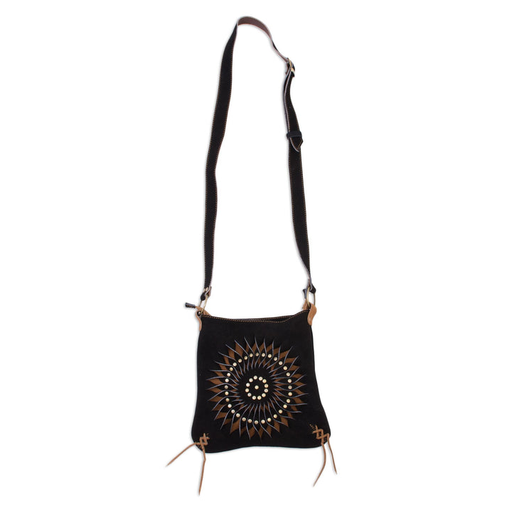 Lida Evaristo of Peru designs a gorgeous black suede sling featuring a mesmerizing laser-cut sun motif. The sun is created by making precise cuts in a circle, then twisting each resulting strip, revealing glimpses of saddle brown suede underneath, and securing it with a rivet. A circle of metal rivets forms the center of the sun. Brown suede lacing accents the bottom of the bag. The roomy main compartment closes with a zipper and is lined in dark brown faux leather with a zipper pocket.